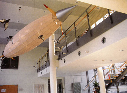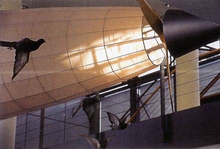 Ein Luftschiff über einem Vogelschwarm reflektiert als fragiles Flugobjekt die architektonischen Qualitäten der „luftigen“ Halle und steht als Symbol für die Gesetze und Grenzen der Physik, denen auch die Hochtechnologie unterliegt.