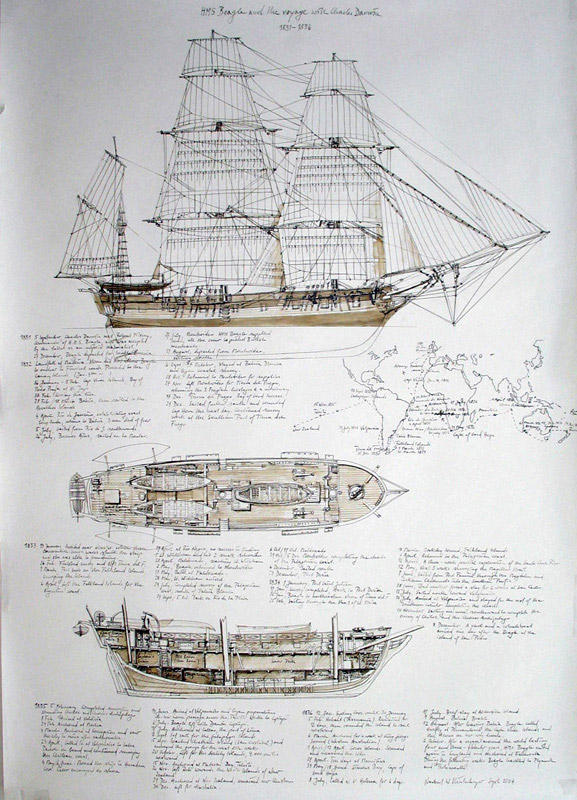 Die Zeichnung der HMS BEAGLE, auf der der Grundstein zu Darwins Theorien gelegt wurde, ist eine Rekonstruktion aus den Modellbauplänen von K.H. Marquardt im Maßstab 1:150. Im hinteren Schiffsteil ist die Kajüte des Kartographen dargestellt, Darwins fahrendes Labor. Neben den Schiffsplänen ist die Reiseroute von England über Brasilien, Südafrika, Australien, die Galapagos-Inseln und um Südamerika gezeichnet und beschrieben.
