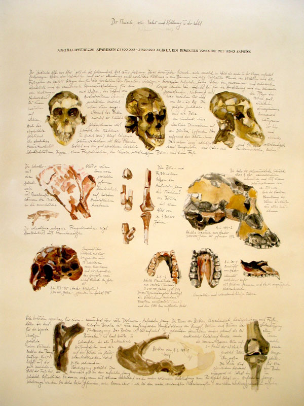 Der "südliche Affe aus Afar" gilt als die bekannteste Art seiner Gattung. Dieser Hominide konnte sich sowohl im Wald als auch in der Steppe aufrecht fortbewegen. Seine Hände wurden frei für Herstellung und Gebrauch von Werkzeugen und Waffen, das Tragen von Gegenständen, Nahrung und die Pflege des Nachwuchses... Der hier abgebildete Schädel des "Mädchens von Dikika" ist - neben "Lucy" - das wichtigste und bis dato vollständigste Hominidenskelett... A.L.444-2, Adultes Cranium aus Hadar, 3.000.000 Jahre, A.L. 200-1, Oberkiefer aus Hadar, A.L. 333-105 aus Hadar (Äthiopien), L.H.-4, Adulte Mandibula aus Laetoli (Tansania), 3.600.000 Jahre, Becken von A.L. 288-1 "Lucy".